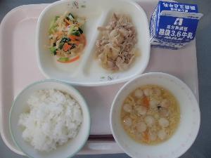 ご飯・牛乳・豚肉の生姜炒め・小松菜の切干あえ・白玉麩のかき玉汁