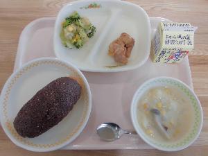ココアビスキュイパン・牛乳・鶏肉のバーベキューソース・ブロッコリーのごまあえ・米粉のシチュー
