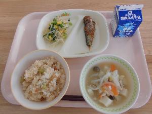 こぎつねご飯・牛乳・いわしの生姜煮・三色ひたし・具だくさん汁