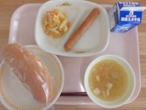 ご飯・牛乳・卵のベーコン巻き・肉野菜炒め・吉野汁・大豆ふりかけ