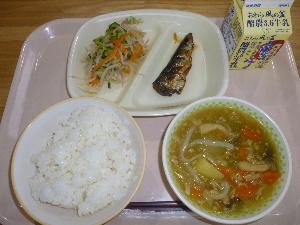 ご飯、牛乳、さばのみそ煮、ほうれん草としめじのひたし、けんちん汁