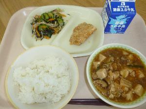 ご飯、牛乳、鶏肉のからあげ、もやしとひじきのナムル、麻婆豆腐