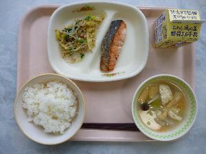 ご飯、牛乳、さけの塩こうじ焼き、スタミナ納豆、大根と油揚げのみそ汁