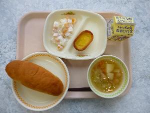 コッペパン、牛乳、コーングラタン、フルーツヨーグルトあえ、ポトフ