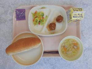 (コッペパン、ブルーベリージャム)(揚げパン)、牛乳、たれ付き肉団子、カラフルサラダ、白菜のスープ