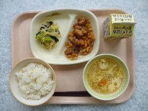 ご飯、牛乳、豚肉と大豆のみそがらめ、キャベツとわかめの甘酢あえ、かき玉汁