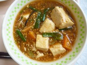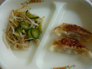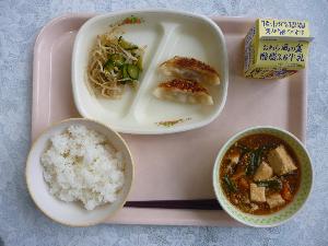 ご飯、牛乳、ギョーザ、もやしのナムル、麻婆豆腐