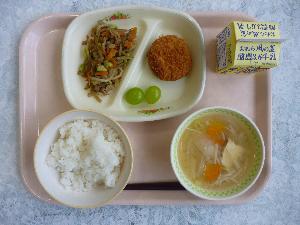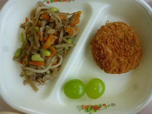 ご飯、牛乳、かぼちゃといものコロッケ、五目きんぴら、えのきのみそ汁、シャインマスカット