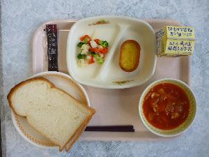 コッペパン、牛乳、ミックスビーンズの揚げがらめ、フルーツヨーグルトあえ、ミネストローネ