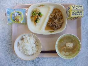 ご飯、牛乳、いわしの梅煮、小松菜の納豆あえ、豚汁、ブルーベリーゼリー