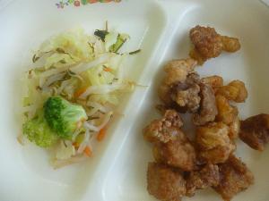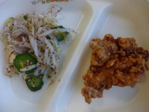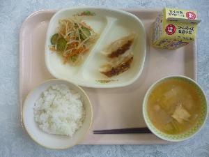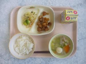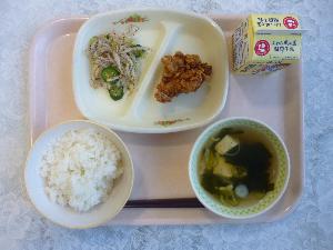 ご飯、牛乳、鶏肉の塩から揚げ、ゆかりあえ、豆腐のすまし汁