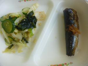 ご飯、牛乳、いわしの生姜煮、キャベツとわかめの甘酢あえ、ピリ辛肉じゃが