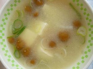 ご飯、牛乳、豚肉と大豆のみそがらめ、こんぶあえ、冬至のだんご汁
