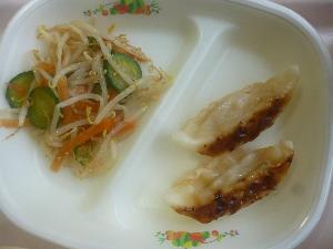 ご飯、牛乳、ギョーザ、もやしのナムル、チゲスープ