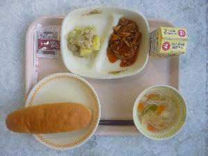 コッペパン、牛乳、鶏肉のマーマレード焼き、海藻サラダ、米粉のクリーム煮
