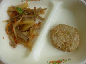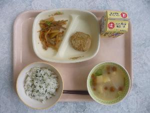 わかめご飯、牛乳、キャベツ入りつくね、変わりきんぴら、なめこ汁