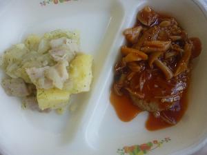 米粉パン、牛乳、ハンバーグのきのこソースかけ、ジャーマンポテト、白菜のスープ、ミルメーク