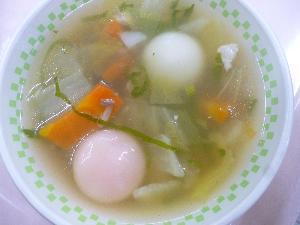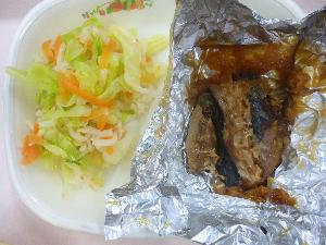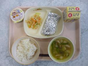 ご飯、牛乳、さばの銀紙焼き、切り干し大根の甘酢あえ、七草だんご汁、お米のババロア