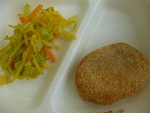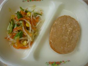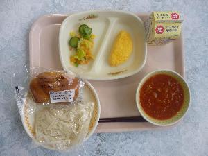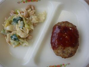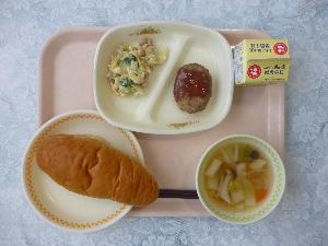 黒糖パン、牛乳、ハンバーグのトマトソースがけ、ビーンズサラダ、白菜のスープ