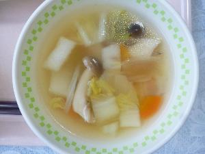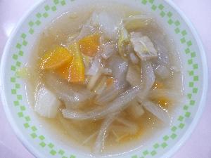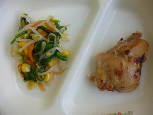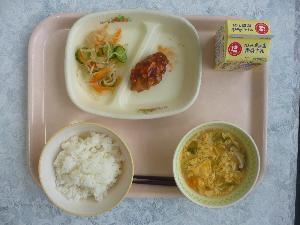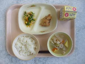ご飯、牛乳、鶏肉のゆず塩麴焼き、小松菜のコーンあえ、豚汁