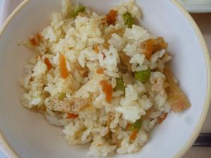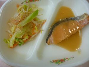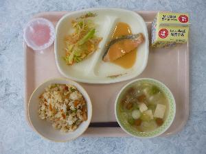 こぎつねご飯、牛乳、さけの甘みそかけ、糸寒天のごま酢あえ、なめこ汁、ミニピーチゼリー