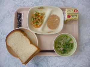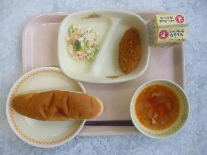 米粉パン、牛乳、コーンコロッケ、マカロニサラダ、ミネストローネ