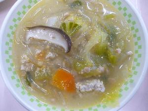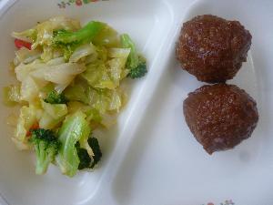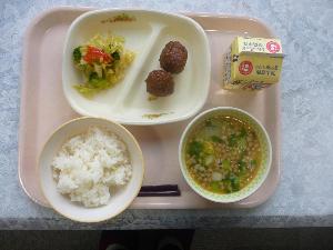 ご飯、牛乳、みそだれ肉団子、ブロッコリーサラダ、担々春雨スープ