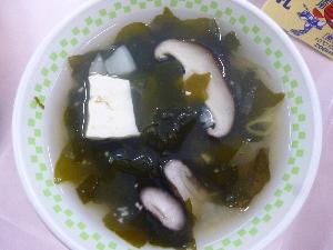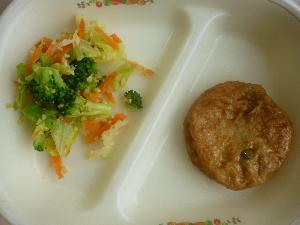 ご飯、牛乳、がんもの含め煮、アーモンドあえ、鶏ごぼう汁、豆乳プリンタルト