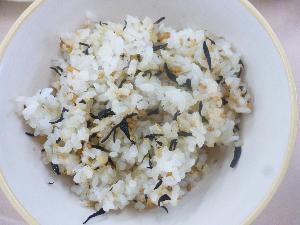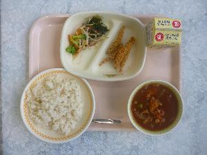 麦ご飯、牛乳、きびなごのカリカリ揚げ、海藻サラダ、ハヤシルウ