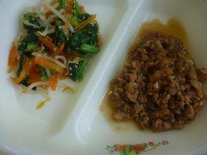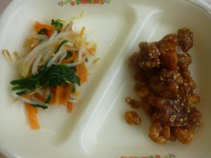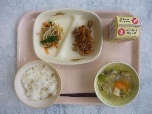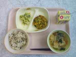 ご飯、牛乳、豚肉と大豆の揚げがらめ、三色ひたし、玉ねぎのみそ汁