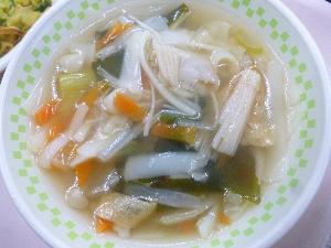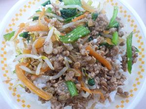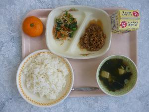 ご飯、牛乳、ビビンバの具、ナムル、中華スープ、みかん