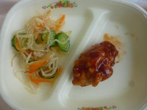 ご飯、牛乳、ヤンニョムチキン、春雨のあえもの、卵とコーンのスープ
