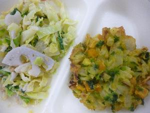 五穀米ご飯、牛乳、ひみコロかき揚げ、れんこんのごまみそあえ、ばち汁