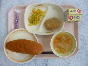 コッペパン、牛乳、コロッケ、ゆで野菜、コンソメスープ、いちごジャム