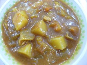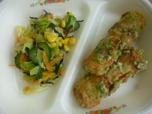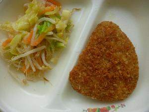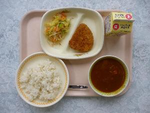 麦ご飯、牛乳、かぼちゃひき肉フライ、糸寒天サラダ、チキンカレー