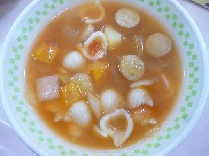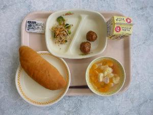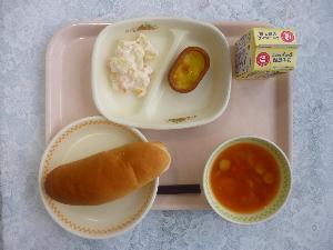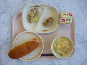 米粉パン、牛乳、コーングラタン、フルーツヨーグルトあえ、ミネストローネ