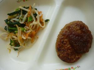 ご飯、牛乳、和風ハンバーグ、アーモンドあえ、なめこ汁