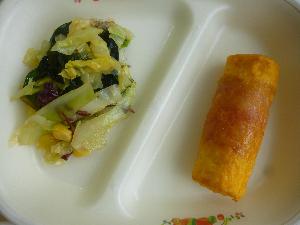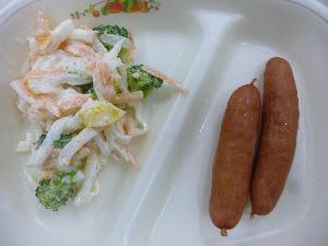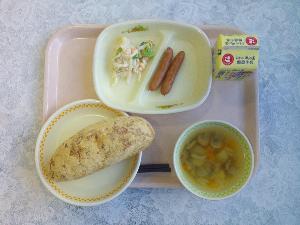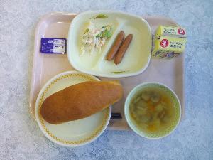 (コッペパン、ブルーベリージャム)(揚げパン)、牛乳、ウインナー、大根サラダ、ABCスープ