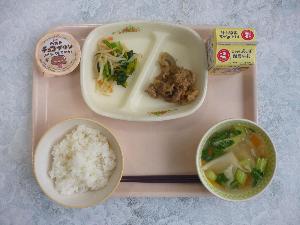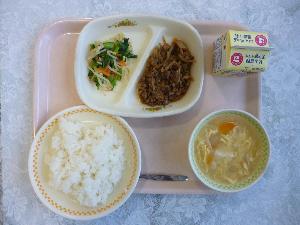 ご飯、牛乳、豚肉のピリ辛炒め、三色ひたし、ワンタンスープ