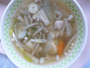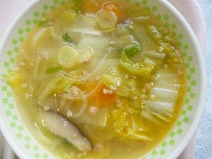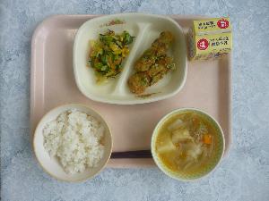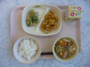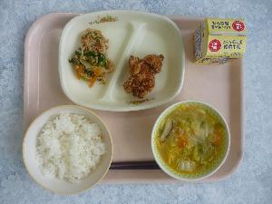 ご飯、牛乳、鶏肉のから揚げ、小松菜の納豆あえ、担々春雨スープ
