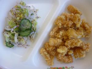 ご飯、牛乳、いかのかりん揚げ、ゆかりあえ、すきやき風煮