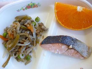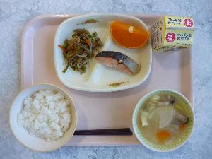 ご飯、牛乳、さけの塩麴焼き、茎わかめのきんぴら、具だくさん汁、せとか
