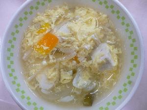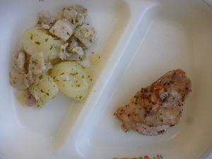 米粉パン、牛乳、鶏肉のマスタード焼き、ジャーマンポテト、茎わかめと卵のスープ