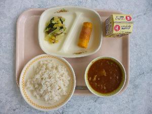 麦ご飯、牛乳、卵のベーコン巻き、海藻サラダ、ポークカレー