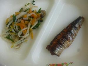 わかめご飯、牛乳、いわしの梅煮、ほうれん草としめじのひたし、鬼よけ汁