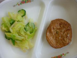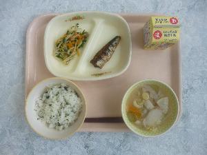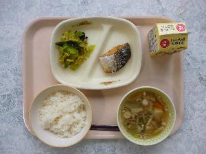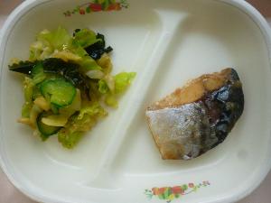 ご飯、牛乳、さばのみそ煮、キャベツとわかめの甘酢あえ、鶏ごぼう汁