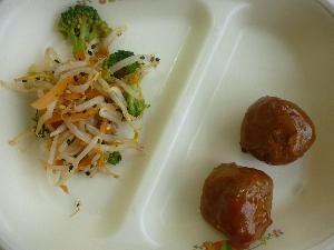 (コッペパン、ブラック&ホワイト)(揚げパン)、牛乳、たれつき肉団子、ごまごまサラダ、フルーツポンチ