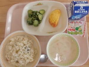 小松菜とベーコンのピラフ・牛乳・オムレツ・きゅうりの華風漬け・豆乳スープ・シークヮーサータルト
