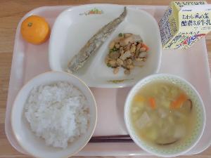 ご飯、牛乳、げんげのから揚げ(頭なし)、五目大豆、さつま汁、みかん