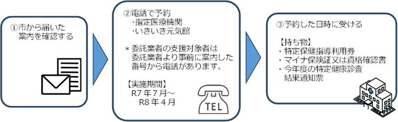 対象になった方には、健診2~3か月後を目途に10月下旬より順次、案内(※特定保健指導利用券)を送付しています。当市では、市の保健師や管理栄養士、指定医療機関、外部の委託業者(SOMPOヘルスサポート株式会社)による保健指導を実施しています。